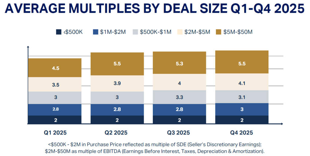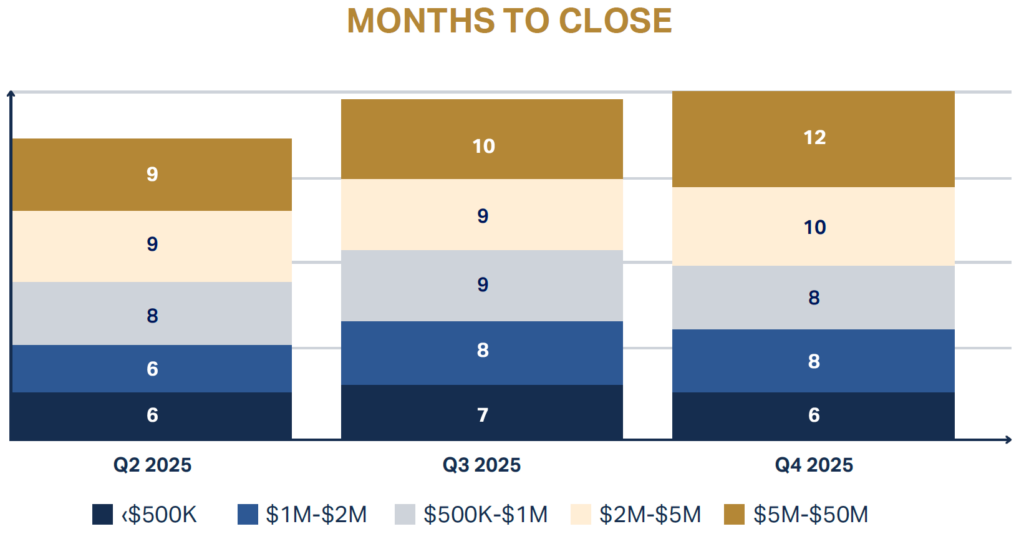 The average amount of time for sellers to get to the closing table increased in 2025 across all size segments. This highlights the importance of seller readiness and preparation. Strong businesses with a clear exit plan in place regularly face less deal delays from listing to closing.