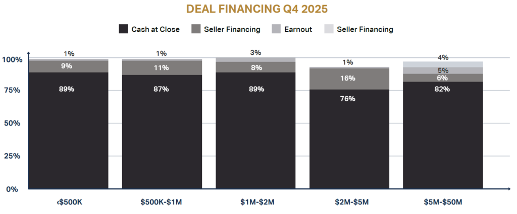 Seller financing and earn-outs continue to play a minor role. This structure reflects high buyer confidence and capital availability, especially in smaller transactions.