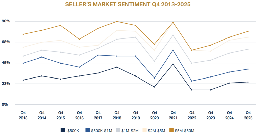 Buyer activity remains high heading into 2026, causing competitive environments. Sellers are regularly getting multiple offers due to continued increase in demand.